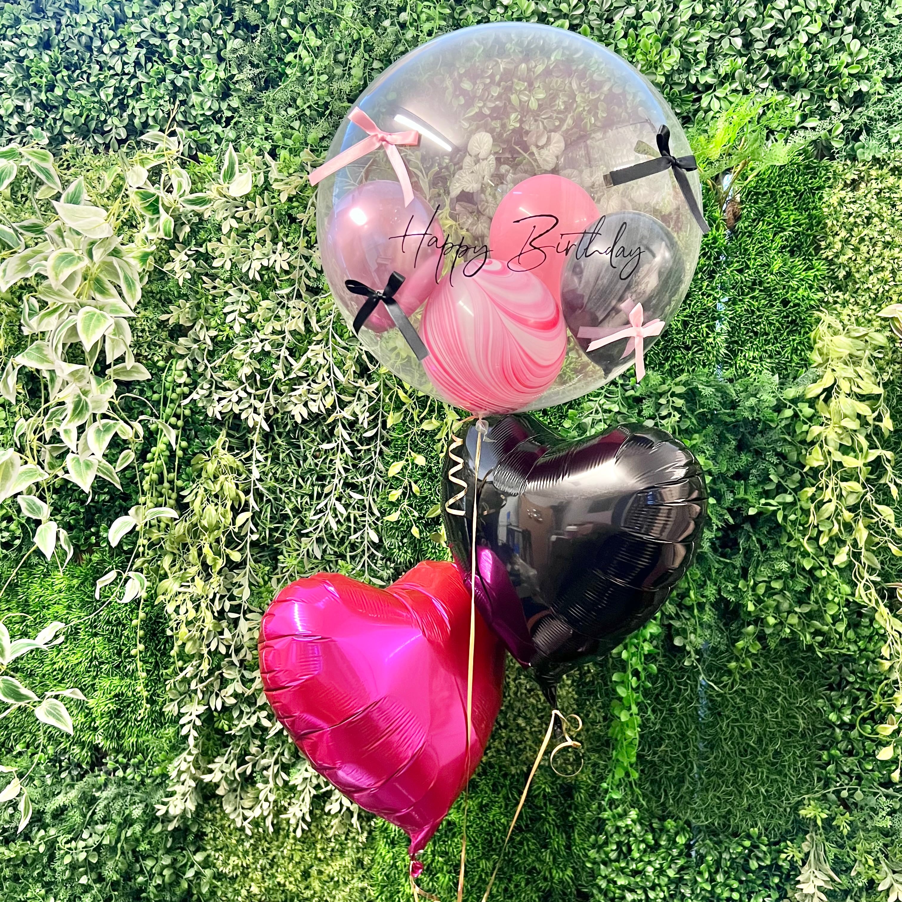 クリアバルーンの中のミニバルーン、リボン、ハートバルーン2つの色が選べます。